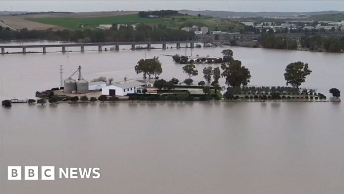 In Córdoba, drone footage showed flooded olive trees as Spanish farmers warned of the millions of euros worth of damage to crops following the torrential rains and high winds.