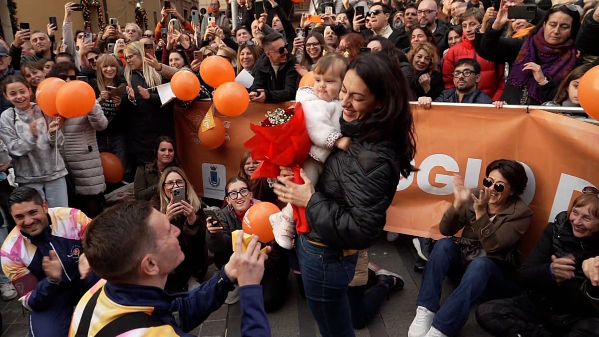 While supporting the Milano Cortina 2026 team on the local leg of the relay, he briefly stepped aside to propose to his fiancée, Chiara, in front of residents who had gathered to watch the torch pass.